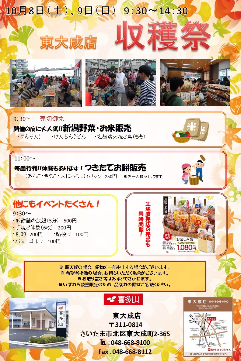 10/8(土)、9(日)の2日間、9:30~14:30まで東大成工場にて秋の収穫祭を開催します。